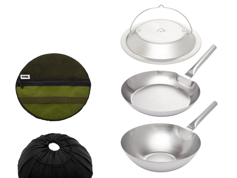 We chose carbon steel for its outstanding properties: even heat distribution, durability, and natural non-stick qualities, all without the use of toxic coatings. Combining the best qualities of cast iron (without the weight), and the packability of camp cookware. The wok, pan, lid, & rigid removable handles pack neatly into a durable Cordura sheath, featuring pockets for cooking accessories and extra space for plates and utensils.