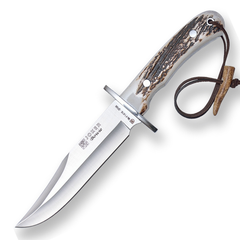 The Joker Bowie Hunting Knife has been manufactured under the Denomination of Origin of Albacete (Spain). It is a perfect sporting knife for your hunting trip. The Joker Bowie hunting knife has a full tang blade made of Mova 1.4116 stainless steel with a blade length of 16 cm, blade width of 5 cm and a thickness of 5 mm. The handle length is 16 cm and is made of deer antler. The Joker Bowie hunting knife is accompanied by a premium leather sheath in brown.