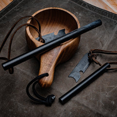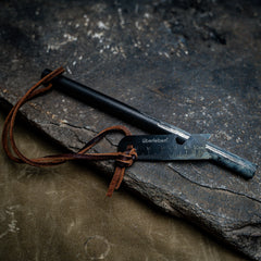 The Kräftig is Überleben's wilderness workhorse. Half-inch thick, Sånft-korr™ ferrocerium, made in Austria. The Kräftig includes a leather lanyard, as well as a 6-function multi-tool striker. Available in 5" or 8" lengths.